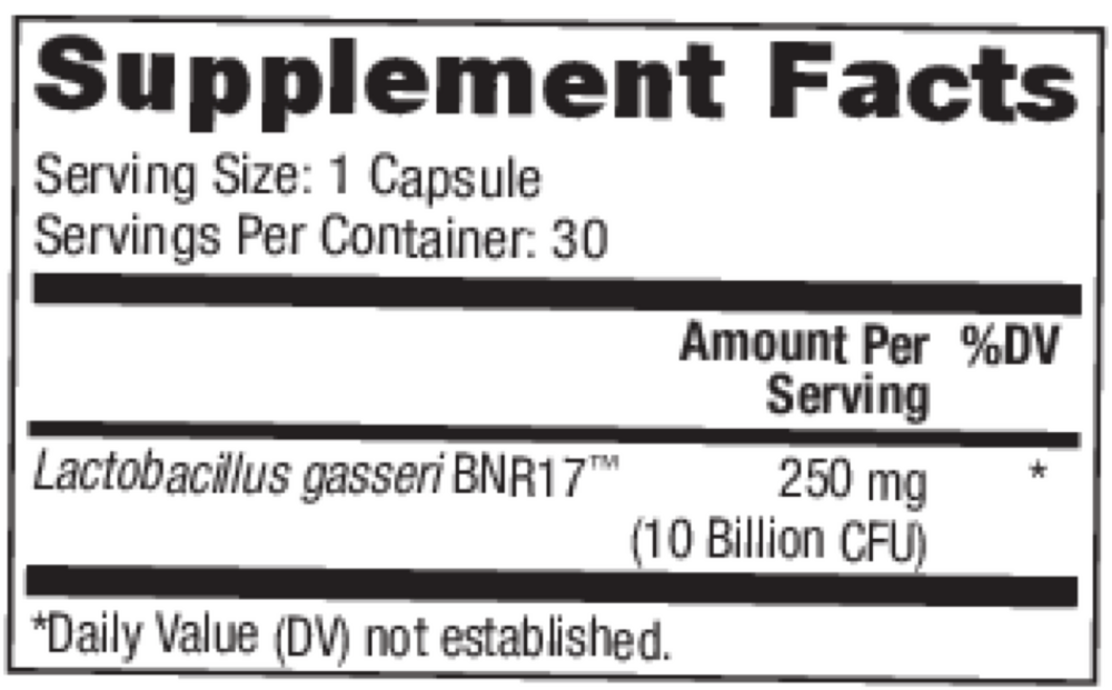 Ingredient Quantity Lactobacillus gasseri BNR17™ 10 billion CFU Other Ingredients: Microcrystalline Cellulose, Delayed Release Capsule (Hydroxypropyl Methylcellulose, Gellan Gum), Fructooligosaccharides, Ascorbyl Palmitate, Silicon Dioxide.Serving size: 1 Capsule