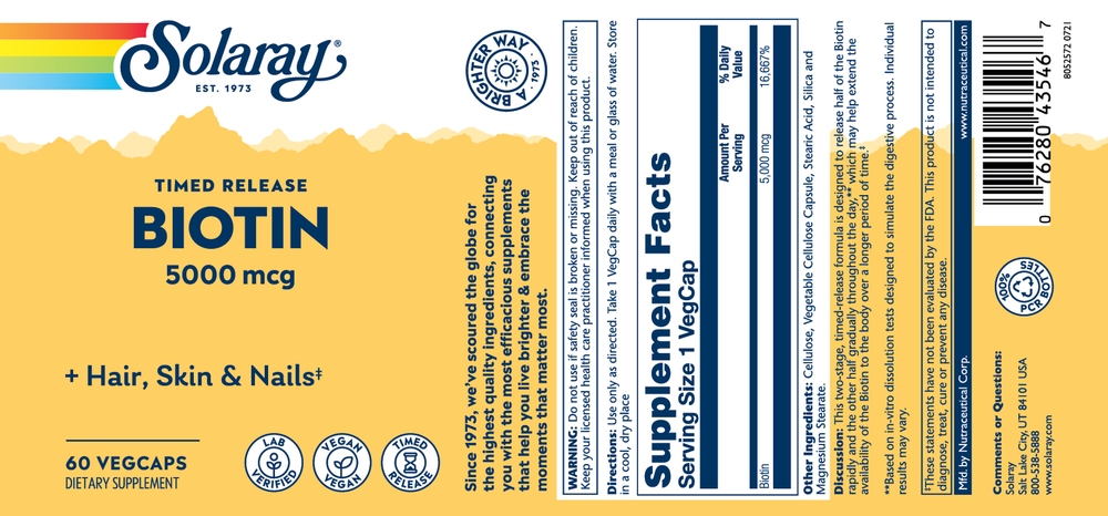 Biotin is an essential B Vitamin that plays a vital role in supporting healthy hair, skin, and nails. This two-stage, timed-release formula is designed to release half of the Biotin rapidly and the other half gradually over a period of up to 8 hours, **which may help extend the availability of the Biotin to the body over a longer period of time. **Based on in-vitro dissolution tests designed to simulate the digestive process. Individual results may vary.