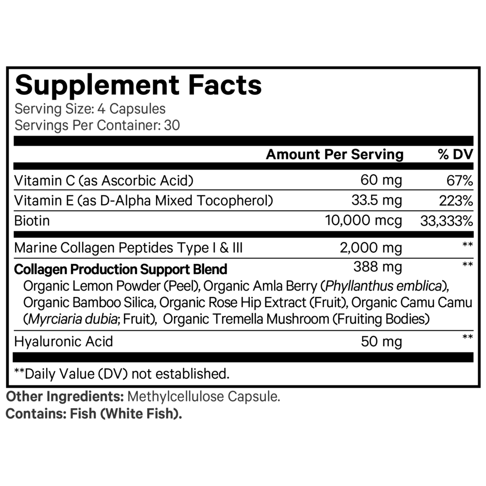 Codeage Biotin Marine Collagen Capsules is a marine collagen formula which offers collagen type 1 & 3 combined biotin, vitamins C & E, hyaluronic acid and amino acids. Their marine collagen peptides powder comes from pure marine sources. Marine collagen is a collagen solution for non-meat eaters. The collagen hydrolysate goes through an hydrolyzation process to help provide a high-quality fish collagen supplement.*This solution features 10,000 mcg of biotin per serving and offers amino acids. The formula also includes an organic blend of fruits, herbs and mushrooms including amla berry, rose hips extracts and lemon powder.