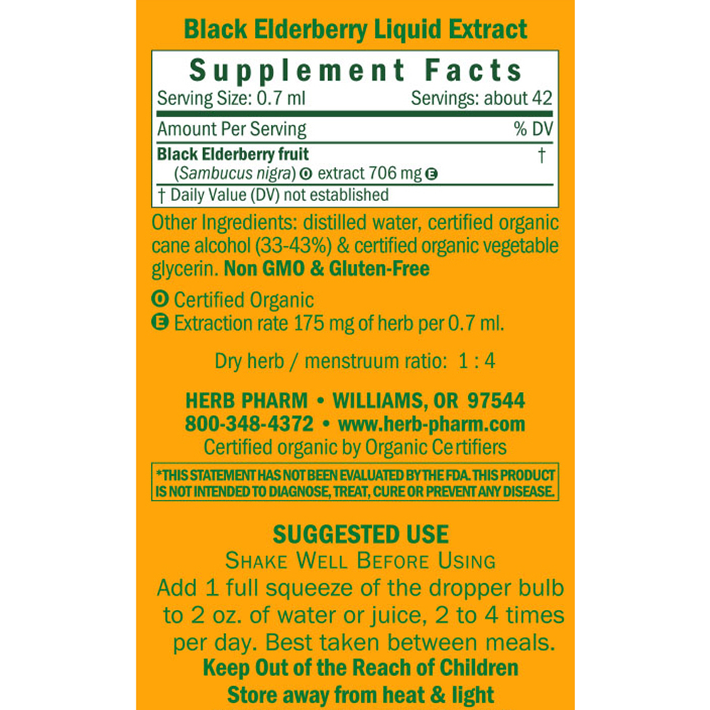 Herb Pharm prepares Black Elderberry Glycerite from the ripe berries of Certified Organic Sambucus nigra trees. The berries are hand-harvested only when ripe to assure optimal extraction of Black Elderberry’s bioactive compounds.