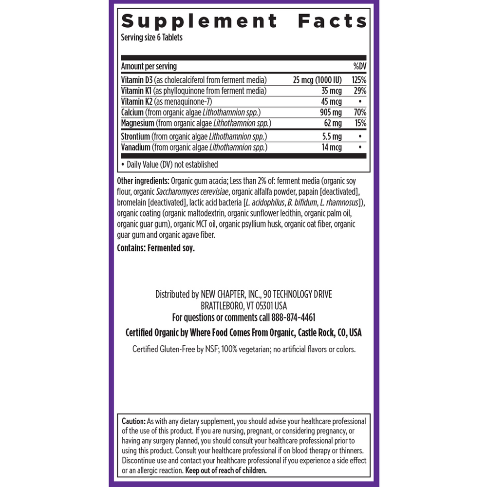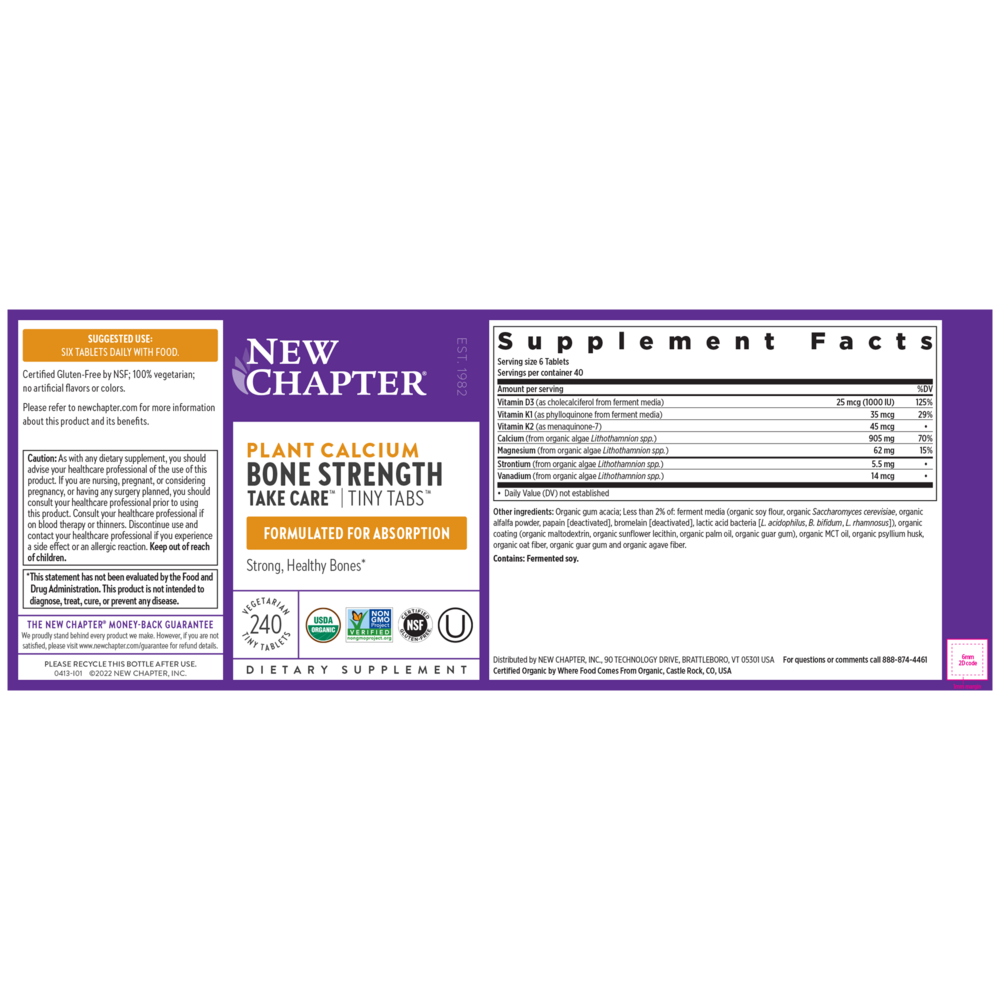 Did you know that most calcium carbonate supplements come from limestone rock and lack other bone-supportive nutrients? Our organic plant calcium is different! Bone Strength Take Care™ is sourced from Red Marine Algae, a whole-food source that’s rich in Calcium plus Magnesium and 70+ trace minerals. No limestone rock! For your best absorbed calcium formula, we add a proprietary blend of Vitamin K2 and fermented D3 that directs calcium right to your bones where you need it, which also helps to maintain artery health.* Experience the magic inside clinical-strength organic plant calcium for 3-in-1 benefits: strong bones, flexible joints, and heart health.* Here at New Chapter®, we sustainably source the highest quality ingredients and craft with you and our planet in mind. We do all this, so you can do you! That’s wellness, well done. *These statements have not been evaluated by the Food and Drug Administration. This product is not intended to diagnose, treat, cure, or prevent any disease.