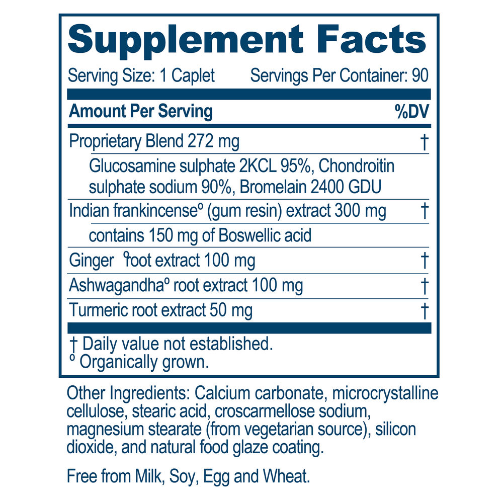 Boswelya Plus™ begins with a standardized extract of Boswellia serrata, which supports a healthy inflammatory response and healthy blood circulation as well as proper joint and cartilage function. Other herbs, such as Zingiber officinale (ginger), Withania somnifera (ashwagandha), and Curcuma longa (curcumin/turmeric) have long been used in Ayurveda to provide support for good joint and cartilage function. Curcumin is also used to support the maintenance of healthy inflammatory response. Ashwagandha can help improve muscle and joint recovery after intense exercise. Boswelya Plus™ also contains glucosamine and chondroitin (sourced from shellfish) for healthy joints through proper nutritional support and bromelain in order to support a healthy inflammatory response.