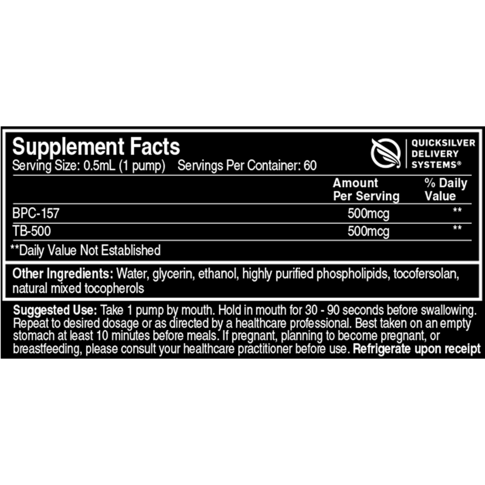 Liposomal BPC-157+TB-500 is a powerful, fast-absorbing peptide complex that delivers two well-researched regenerative compounds—BPC-157, a 15-amino acid derivative naturally found in the human gut, and TB-500, the active region of the healing protein Thymosin Beta-4 (Tβ4). Together, these peptides offer a broad-spectrum solution to support acute and accelerated tissue healing, muscle repair and growth, vascular support, and longevity dynamics.* Delivered using Quicksilver Scientific’s advanced liposomal delivery system, this formula enhances bioavailability and cellular uptake for rapid, systemic results.*