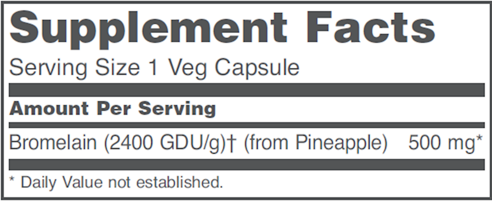 Bromelain is a proteolytic (protein digesting) enzyme derived from the pineapple plant.* It is functional throughout a wide pH range and does not lose its activity as it goes through the acidic environment of the stomach.* Scientific studies indicate that Bromelain is highly bioavailable and may help to alleviate normal transient pain and discomfort associated with occasional overuse.* This product has 500 mg of natural Bromelain per capsule and is suitable for vegetarians.