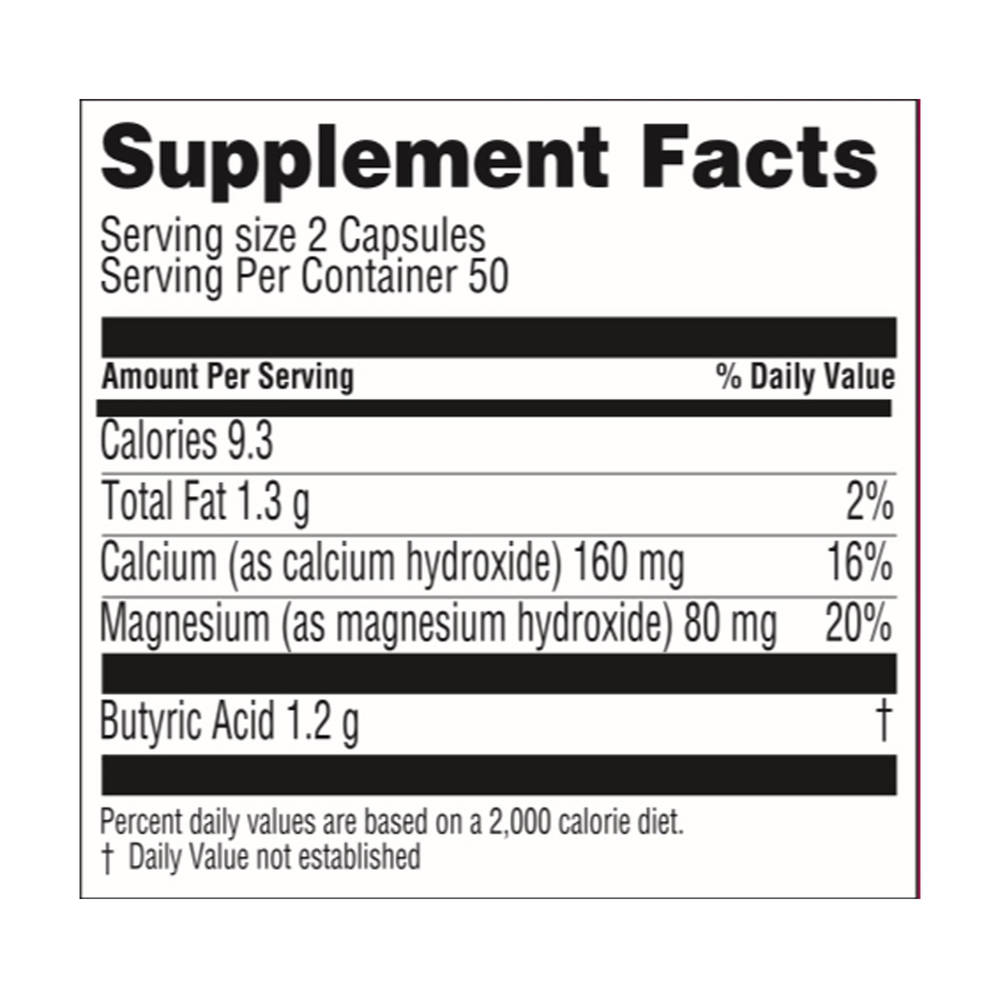 Each capsule contains at least 600 mg butyric acid as calcium/magnesium butyrates. Micro-encapsulated design delivers butyrate to the colon without breaking down in the intestinal tract.