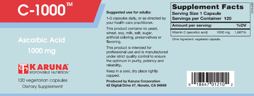 Vitamin C is known for its multiple essential and supportive roles in human health. Nobel-laureate Linus Pauling famously recommended plain ascorbic acid as the most efficient form for supplementing vitamin C. Karuna's C-1000 supplies pure ascorbic acid in preservative-free vegetarian capsules for convenient use.