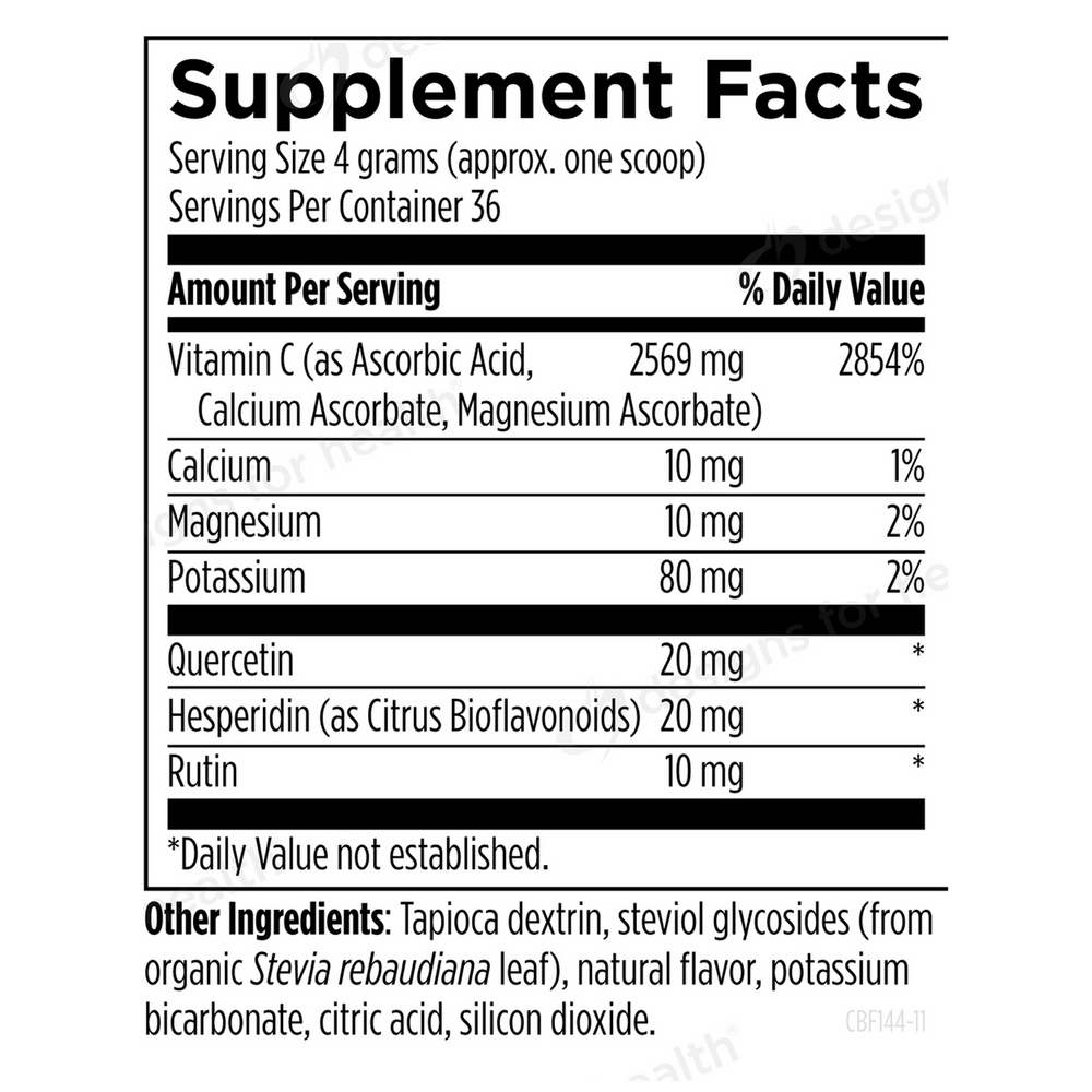This delicious, effervescent, orange-flavored powder easily provides therapeutic dosing of vitamin C.* Potassium bicarbonate is included in this formula as a buffering agent and to give it “fizz.“ Also included are quercetin, hesperidin and rutin, which are natural bioflavonoids found in citrus fruits.