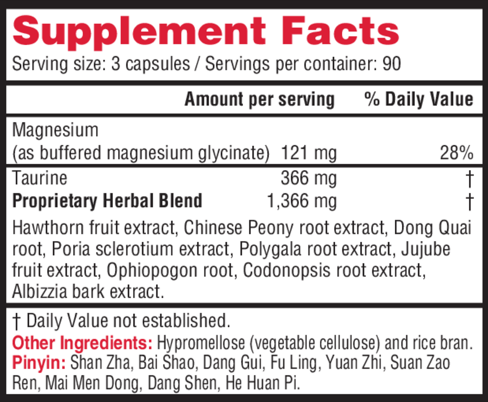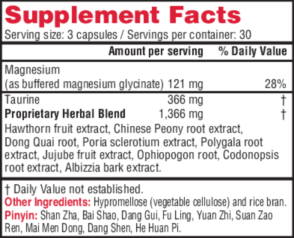 Hawthorn fruit extract (shan zha), Chinese Peony root extract (bai shao), Dong Quai root (dang gui), Poria sclerotium extract (fu ling), Polygala root extract (yuan zhi), Jujube fruit extract (suan zao ren), Ophiopogon root (mai men dong), Codonopsis root extract (dang shen), Albizzia bark etract (he huan pi).