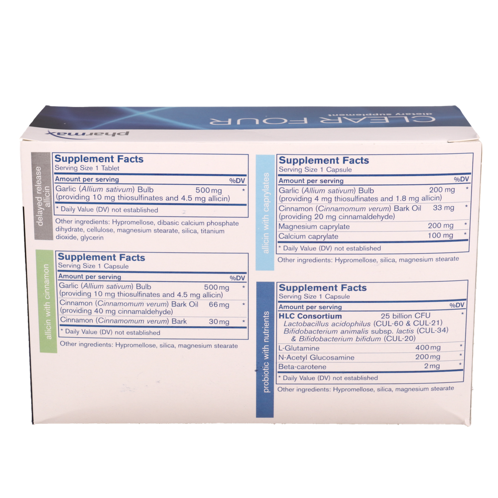 Clear Four is a unique combination of human-sourced probiotics, allicin, cinnamon, N-acetyl glucosamine (NAG), L-glutamine, and beta-carotene. The probiotic formulation used in Clear Four contains 25 billion CFU of human-sourced probiotics that support optimal gastrointestinal health.* Allicin and cinnamon help to maintain natural healthy gut flora.* Studies indicate that L-glutamine helps to maintain normal intestinal barrier function by supporting intestinal barrier permeability.*