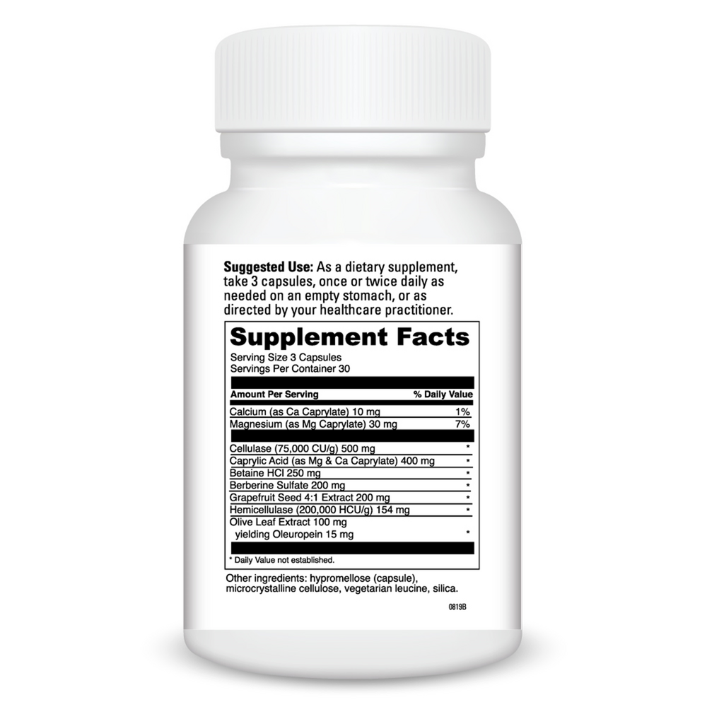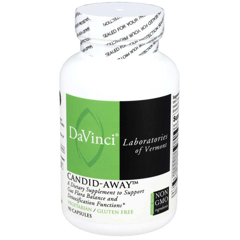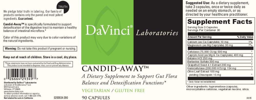 Candid-Away™ is specifically formulated to support detoxification of the digestive tract to maintain a healthy balance of intestinal microflora.* It combines a unique mixture of Olive Leaf Extract to support immune system function, Calcium Caprylate and Grapefruit Seed Extract to maintain a healthy balance of intestinal microflora, Berberine to inhibit the growth of non-beneficial yeast, bacteria and protozoa, Betaine HCl for acid balance in the stomach and fiber digesting enzymes (cellulase and hemicellulase) to balance beneficial and non-beneficial microflora and digest candida.*