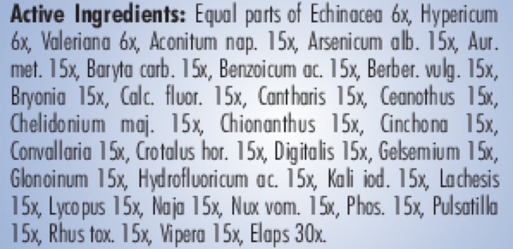 15x, Rhus tox. 15x, Vipera 15x, Elaps 30x.Inactive Ingredients: USP Purified water; USP Gluten-free,