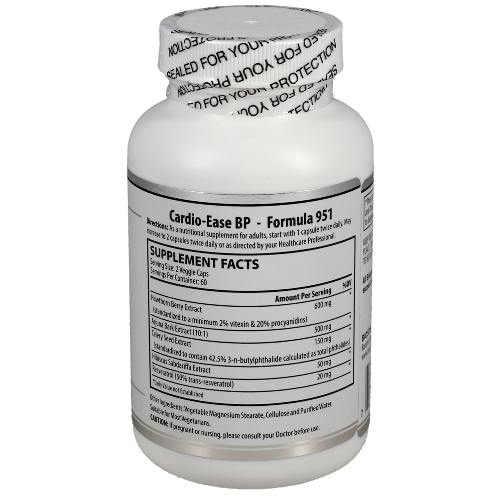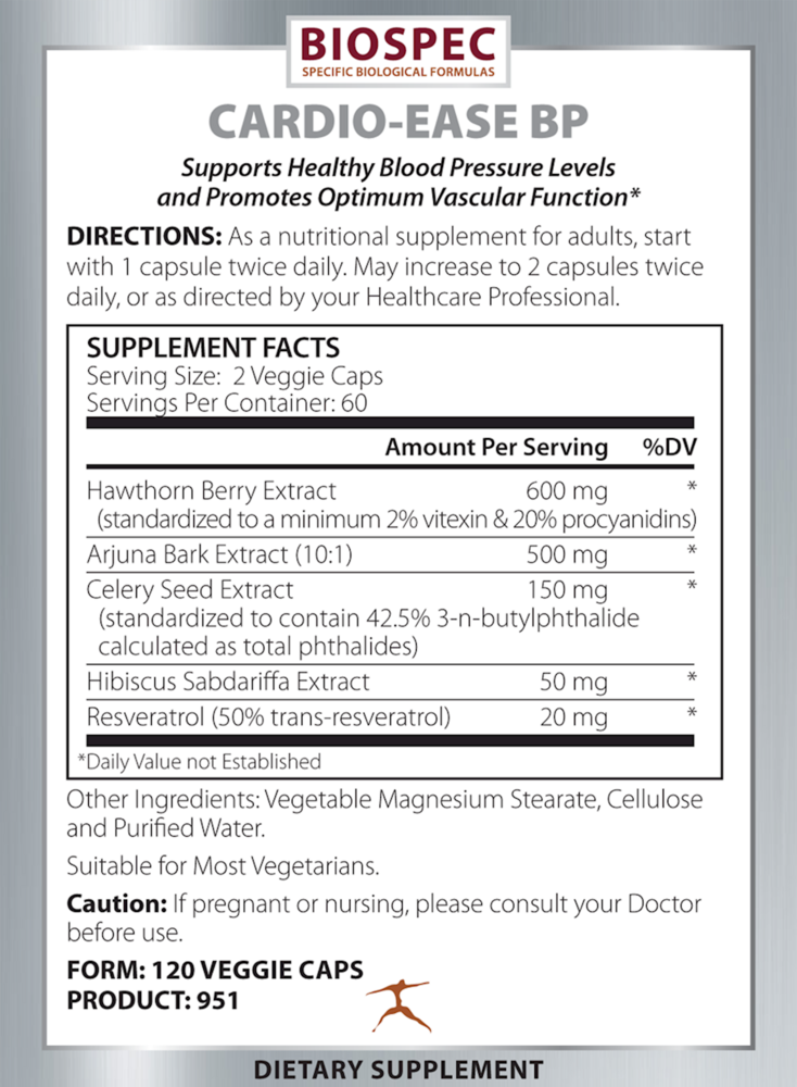 Cardio-Ease BP is a high potency combination of Celery Seed Extract, Hawthorne Extract and Arjuna Bark Extract plus Hibiscus Sabdariffa Extract and Resveratrol to support cardiovascular function and maintain normal blood pressure levels already within normal range.*