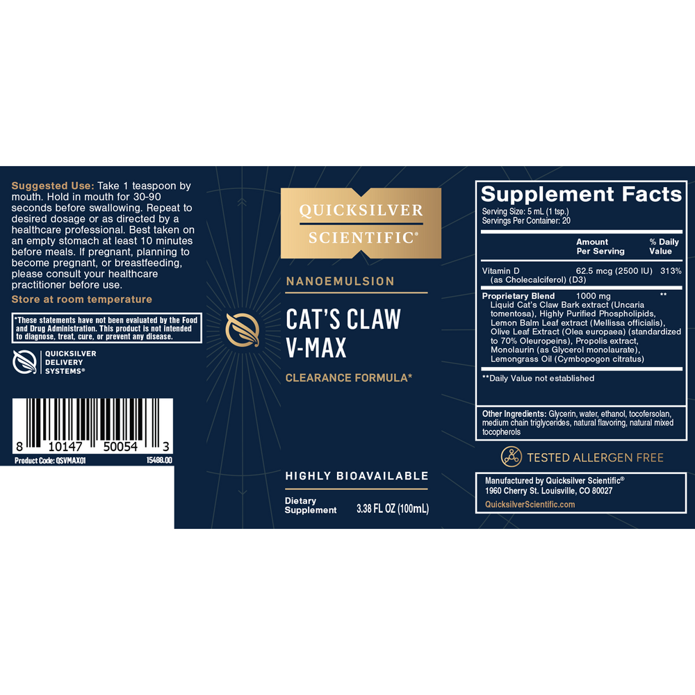 Cat’s Claw V-Max is a targeted blend of botanicals and nutrients designed to support the body’s natural defenses against microbial stressors and facilitate a resilient immune response. Vitamin D3, liquid Cat’s Claw extract, lemon balm, olive leaf, propolis, monolaurin, and lemongrass oil help inhibit pathogen adherence, aid in pathogen clearance, and support a productive immune response, making the body less hospitable to these common stressors.