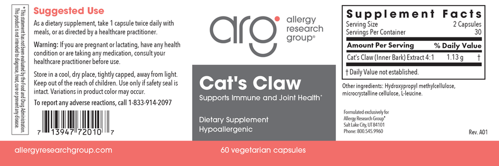 Cat's Claw or Uña de Gato (Uncaria tomentosa) is an herb that grows wild in the highlands of the Peruvian Amazon. The native Ashanica Indians have used the inner bark of cat's claw for possibly thousands of years.* Recent research in Europe and China has identified the alkaloid compounds in cat's claw that possess antioxidant properties. Allergy Research Group® cat's claw is derived from only the inner bark.