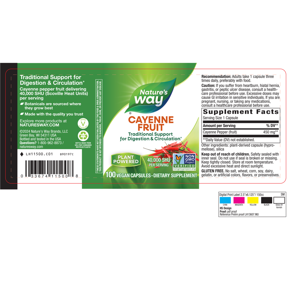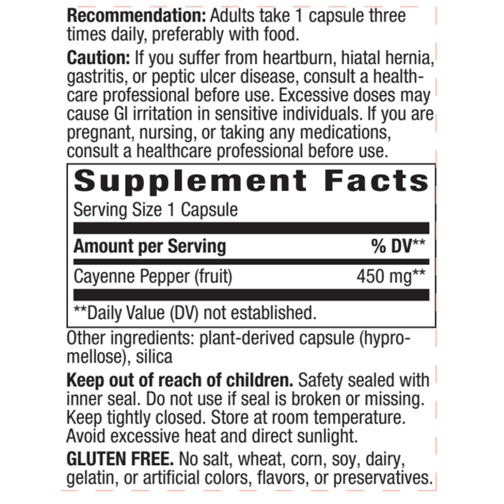 Cayenne Pepper (Capsicum annuum) fruit is a warming herb that has an invigorating effect.* Our Cayenne has a consistent potency of 40,000 S.H.U (Scoville Heat Units). Our Cayenne is carefully tested and produced to superior quality standards.