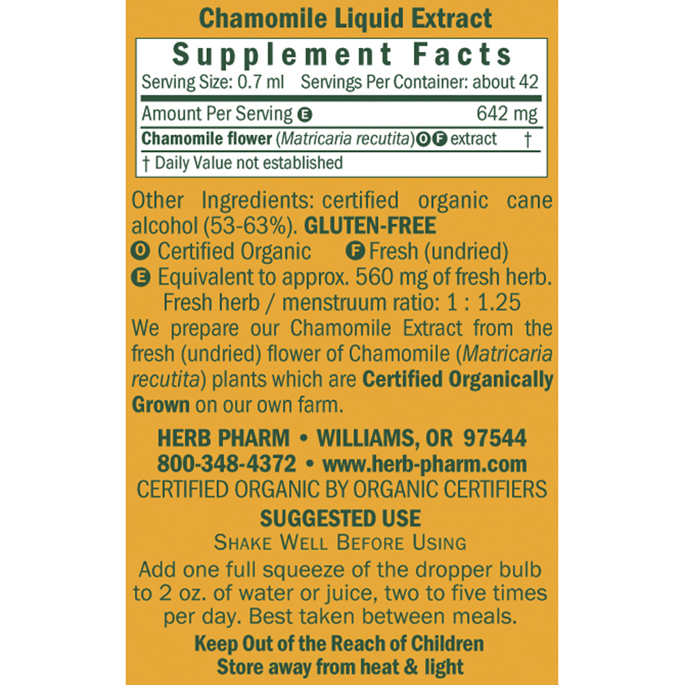 Herb Pharm prepares Chamomile extract from the flower of Certified Organic Matricaria recutita plants grown on its own farms in southern Oregon. Chamomile is hand-harvested in the late spring and extracted fresh the same day.