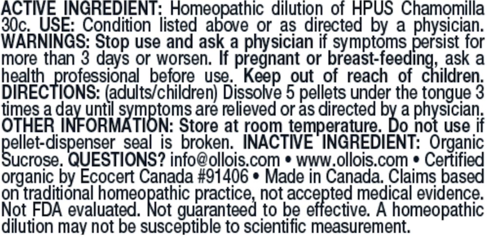 Homeopathic. Ollois organic certified and lactose free Chamomilla 30C is traditionally used for: teething, irritability, and restlessness. †