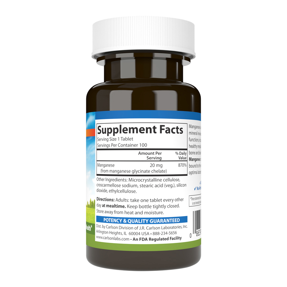 Manganese is an essential trace mineral involved in many key body functions, including supporting a healthy metabolism, and bone and brain health. While most manganese supplements aren't easily absorbed and can cause an upset stomach, Carlson Chelated Manganese is blended with the important amino acid glycine, allowing it to pass through the digestive tract gently and to be highly absorbable.