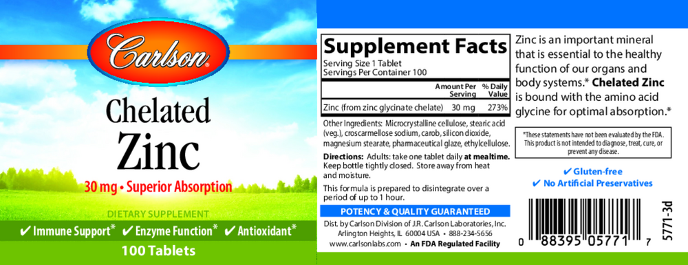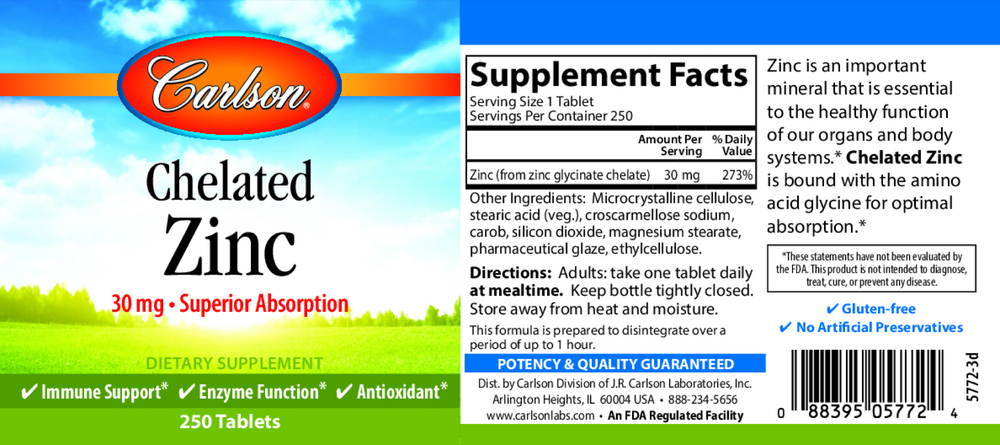 Most of us recognize zinc for its immune supporting properties and ability to help fight off free radicals, but this important mineral offers many more health benefits. Zinc is found in every tissue in our body and is directly involved in cell division and normal growth, as well as several other important functions. Some people have difficulty absorbing standard zinc supplements, which is why they opt for Carlson Chelated Zinc, blended with the important amino acid glycine for optimal absorption.