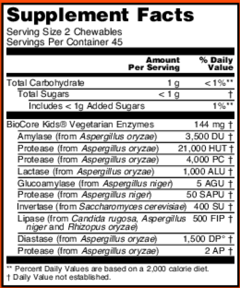 Broad Spectrum Chewable EnzymesNatural Berry FlavorGreat for Adults & KidsChewyZymes™ is a broad spectrum digestive enzyme formulation in a natural berry-flavored, vegetarian chewable tablet for adults and children. It is designed to support optimal digestion of meals.* Digestive enzymes are essential to the body's absorption and full use of food.* The enzymes used in this product have been tested in a controlled laboratory study and have been shown to be active throughout the entire pH range of the digestive system and to not be degraded by acid in the stomach.*BioCore® and BioCore Kids® are registered trademarks of National Enzyme Company.
