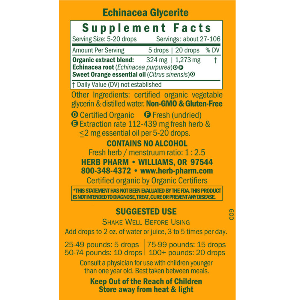 Herb Pharm prepares Kids Echinacea from Certified Organic Echinacea purpurea root and Certified Organic sweet orange essential oil for kid-friendly flavor. Herb Pharm grows its Echinacea on its farms in southern Oregon. To assure optimal extraction of Echinacea’s bioactive compounds, they harvest the roots during the autumn.