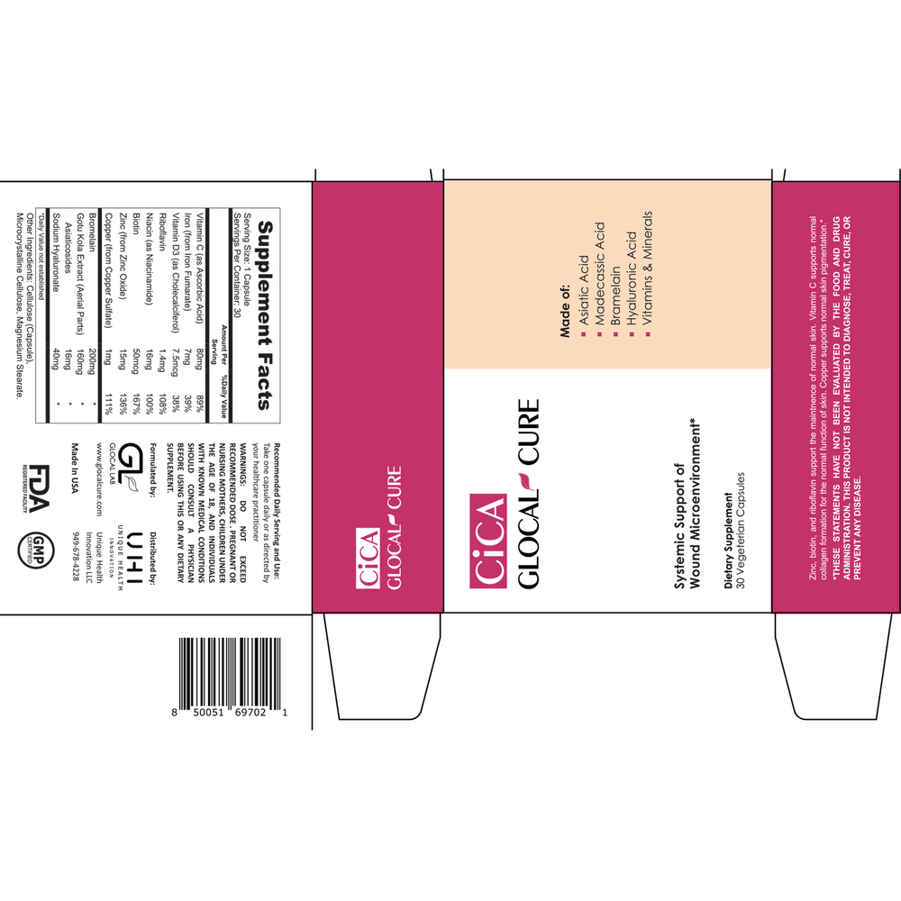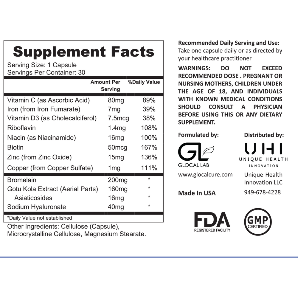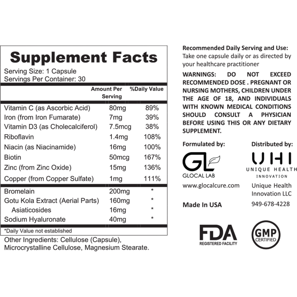 Clinically studied Cica GlocalCure Capsule supports skin health and complements post-procedural recovery through healthy inflammatory, pro-collagen bioactives.* (Teca - Centella Asiatica Extract, Bromelain, Asiaticosides Complex, Hyaluronic Acid, Biotin, Zinc, Vitamin C)
