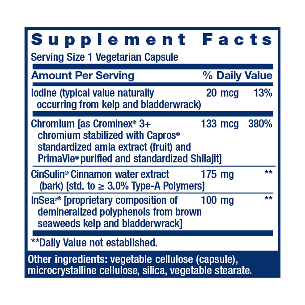 This blood sugar health support supplement includes a highly purified, water-soluble form of cinnamon known as CinSulin®, InSea2® seaweed extract, and potent Crominex® 3+.*