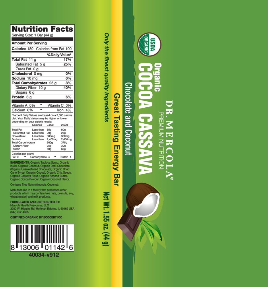 If you’re a chocolate lover, the Cocoa Cassava bar is for you. My Organic Cocoa Cassava Bar contains both organic dark chocolate with 56 percent cacao and organic raw cacao powder.
