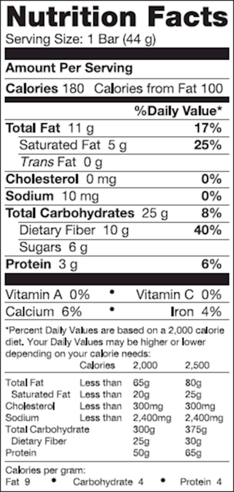 My Organic Cocoa Cassava with coconut and chia seeds is our all-time favorite chocolate-coated gourmet snack bar. Because Cocoa Cassava now has 10 g of fiber and only 6 g of sugars, you can continue to enjoy our top selling bar with even less guilt!