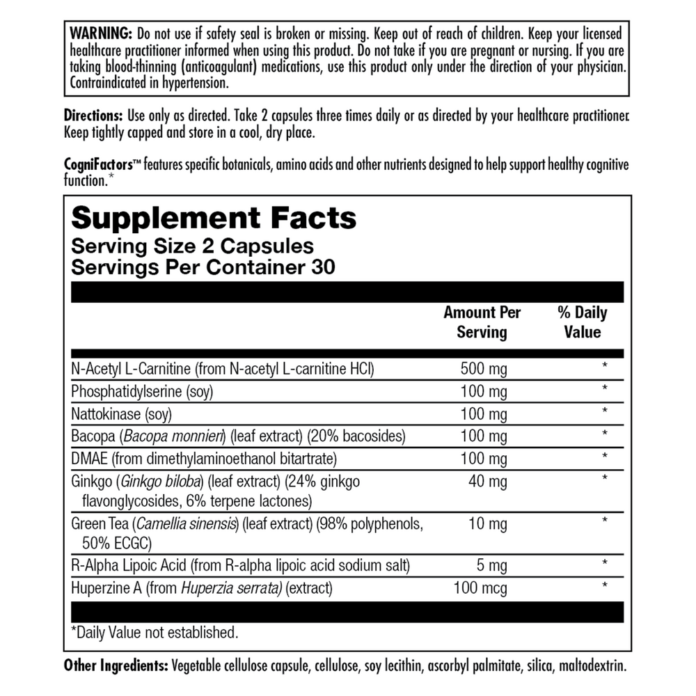 CogniFactors features specific botanicals, amino acids, circulatory aides, antioxidants, and other nutrients intended to provide nutritive support for healthy cognitive function.*