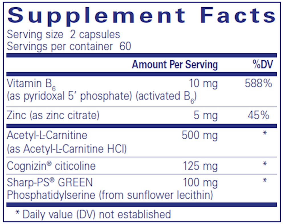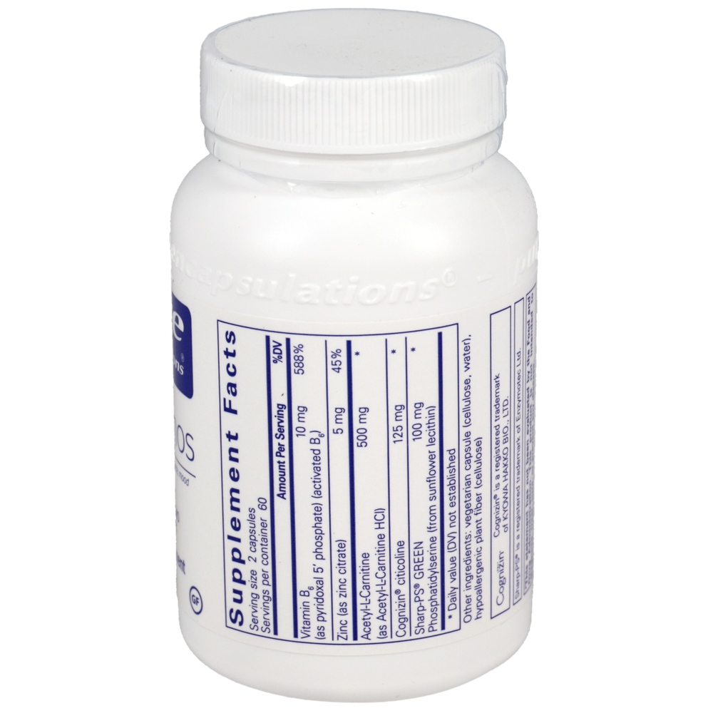 Acetyl-l-carnitine (ALC) offers support for cellular energy, mood and neuronal function. A meta-analysis of 21 randomized controlled studies and 1,204 older subjects indicated that ALC offered statistically significant support for memory, performance and higher intellectual function. In other trials involving children, ALC promoted daily mental function and behavior in a subset of subjects. Citicholine and phosphatidylserine support healthy brain phospholipid composition. Phospholipids are essential for neuronal communication and protection. Research indicates that patented Cognizen® citicholine increases choline and phospholipid composition in the brain. Studies in children, middle-aged adults and elderly adults indicate that it supports healthy cognition across a wide age range. In two studies, one involving adolescent boys and another involving middle-aged women, 250-500 mg Cognizin® citicholine offered significant support for daily mental task performance. Numerous studies indicate phosphatidylserine promotes healthy mental acuity and behavior in elderly subjects, as well as children. Zinc and vitamin B6 are important cofactors for neuronal function.*