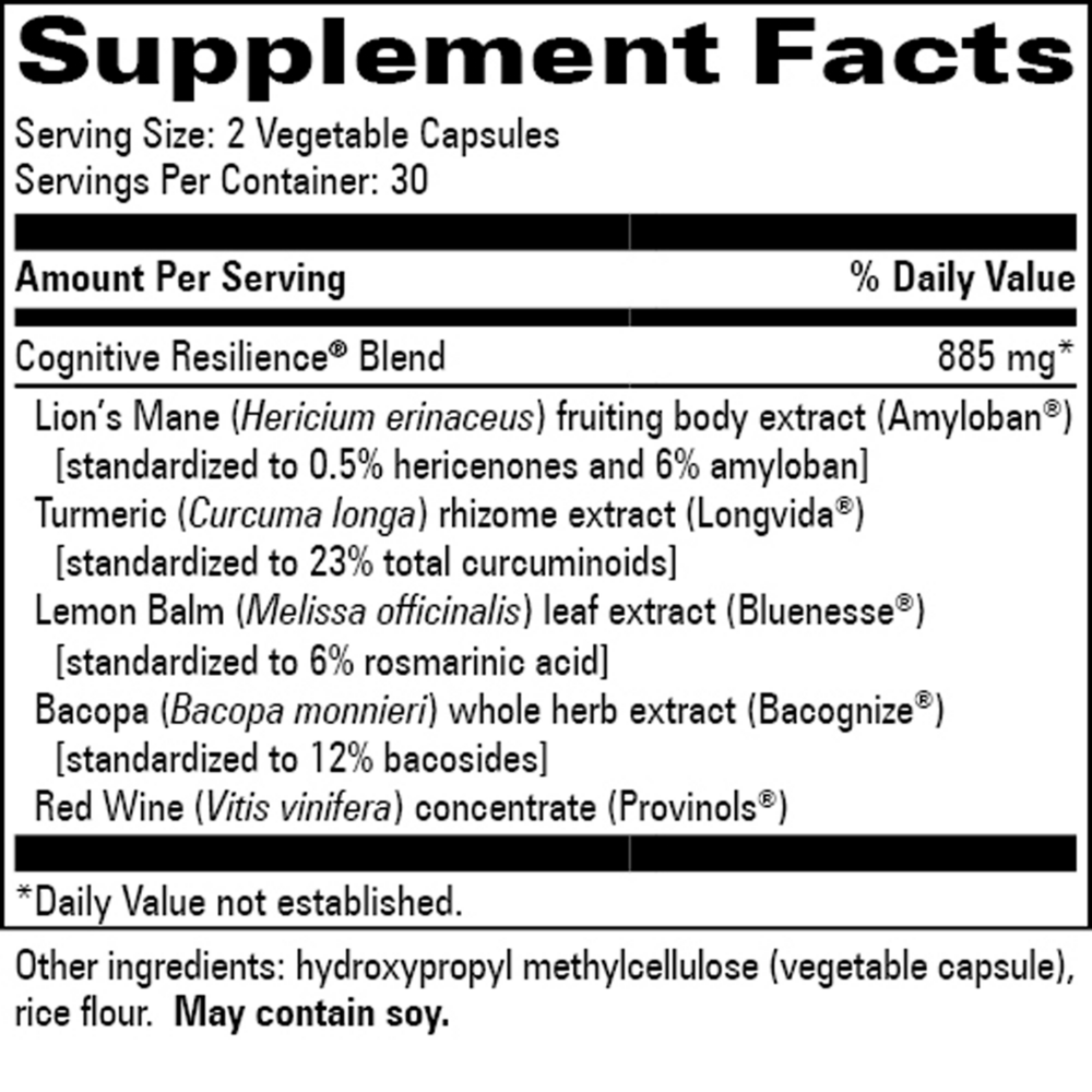 Cognitive Resilience® from Progressive Laboratories is a proprietary formula that is a unique blend of botanicals designed to support optimal cognitive performance and neurodegeneration particularly around learning, memory, focus, concentration and attention.*