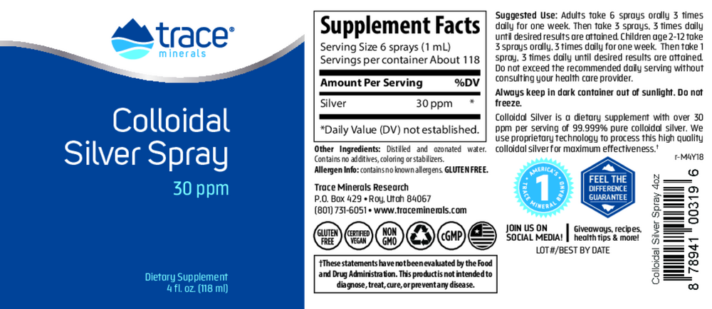 Colloidal Silver is a dietary supplement with over 30 ppm per serving of 99.999% pure colloidal silver to support and maintain a healthy immune system.* Trace Minerals use proprietary technology to process this high quality colloidal silver for maximum effectiveness.*