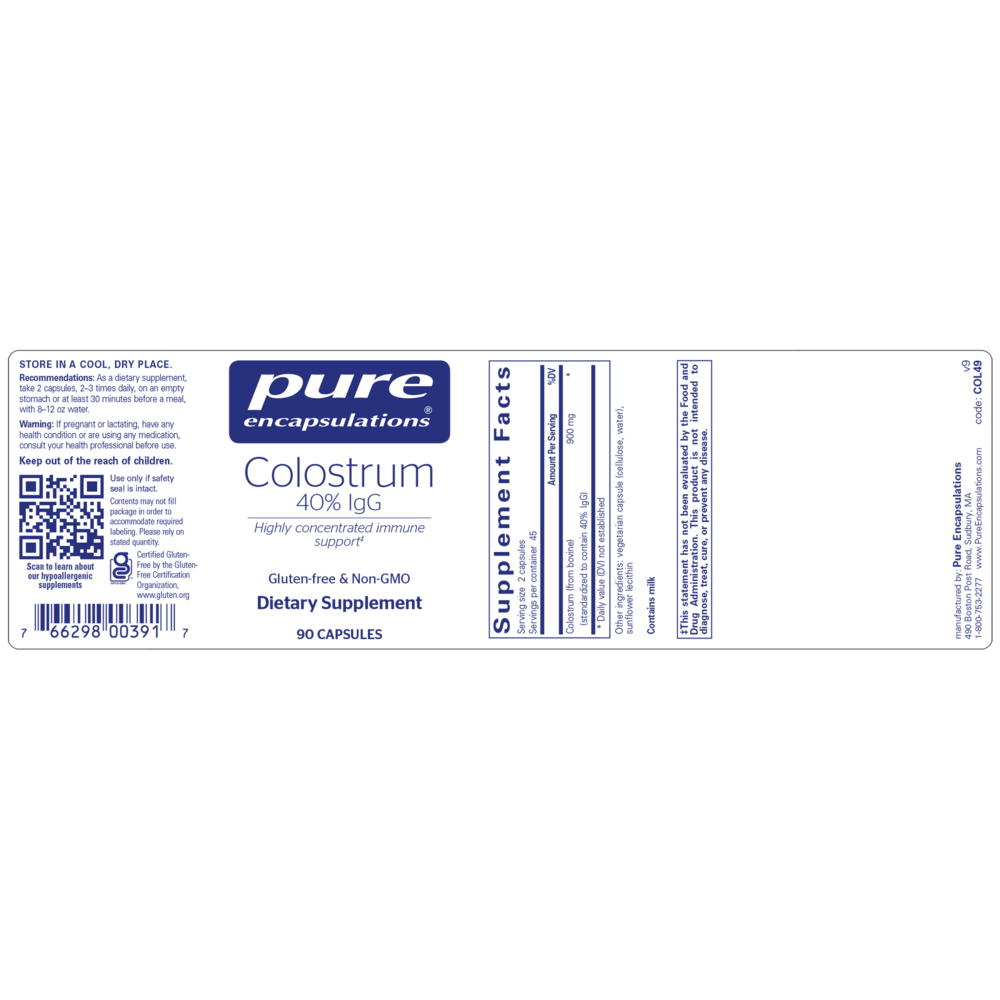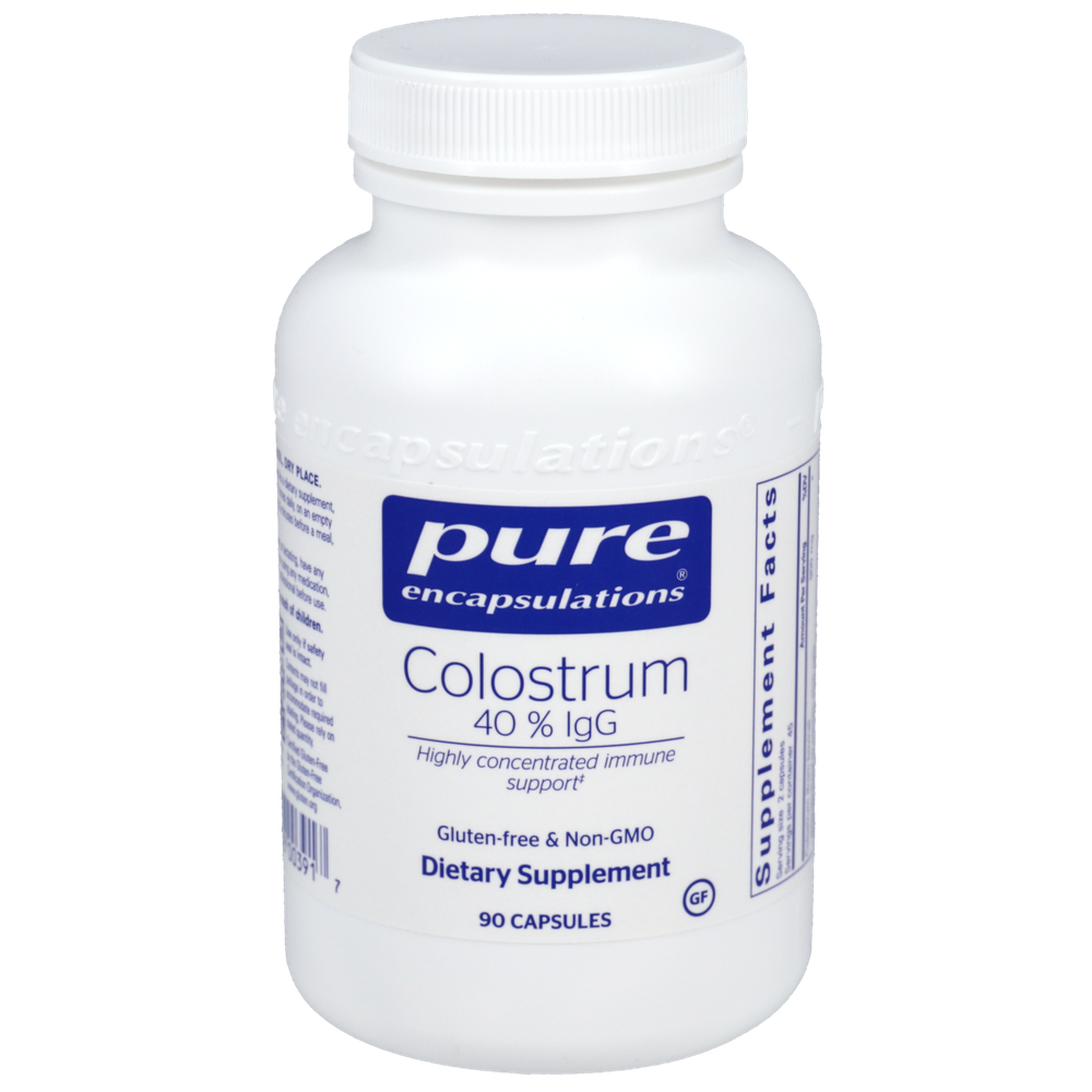 Colostrum is a highly-concentrated source of immune and growth factors produced from mammary glands shortly after giving birth. Pure Encapsulations Colostrum is derived from BSE-, hormone-, pesticide- and antibiotic-free USDA certified dairy farms in the U.S. It is collected after the first 24 hours, defatted and standardized to contain 40% IgG. Colostrum contains immunoglobulins G (IgG), A (IgA), E (IgE), D (IgD), and M (IgM). Each has a specific role in immune health. IgG is naturally found in the highest concentration. Other naturally occurring immune support compounds include lactoferrin, proline-rich polypeptide (PRP), lymphokines, interferons, interleukins, oligosaccharides, lysozymes, insulin growth factors (IGF-1 and IGF-2) and transforming growth factors (TGF-A and TGF-B).*