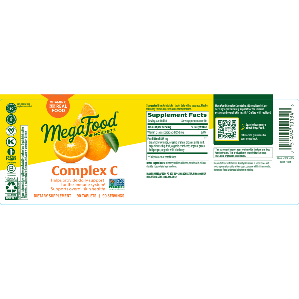 This is an immune system champion, right here!* MegaFood Complex C takes immune-supportive Vitamin C and combines it with two powerful blends to deliver a broad spectrum of phytonutrients: Megafood's Organic Bioflavonoid Complex (organic amla fruit, organic green pepper, organic rose hips and organic orange peel), and Fruit Phenolic Blend (organic orange, organic cranberry and organic blueberry).*