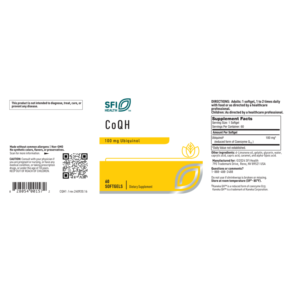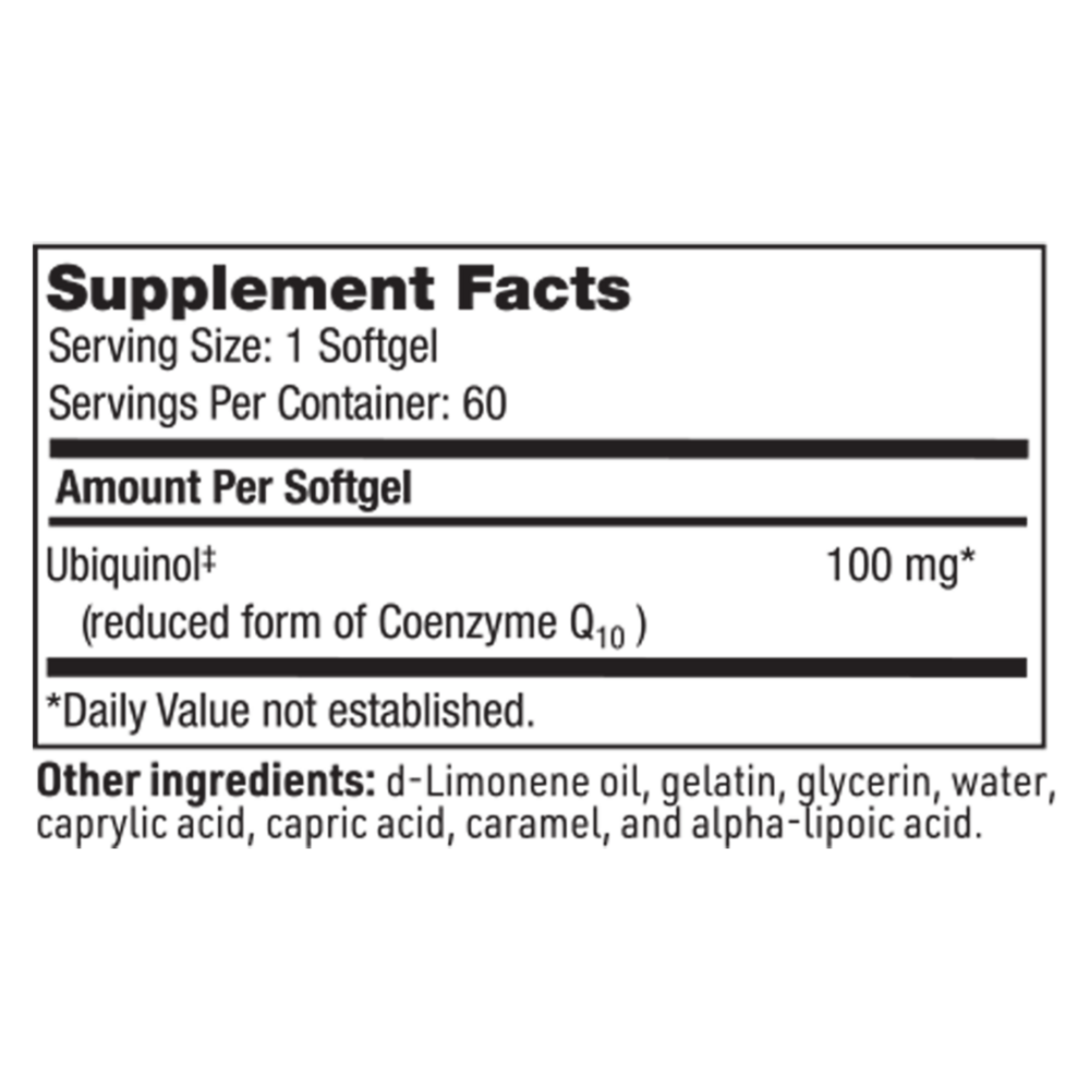 Two beneficial forms of coenzyme Q10 (CoQ10), ubiquinone and ubiquinol, are continually recycled in the body. Ubiquinol acts as a powerful antioxidant in mitochondria and lipid membranes.* Both ubiqiuinol and uiquinone are needed for the efficient production of ATP. This formula is specifically indicated for individuals unable to efficiently reduce ubiquinone. CoQH also contains ubiquinol, solubilized in d-limonene oil and stabilized with natural emulsifying agents, which can be directly utilized by the body.