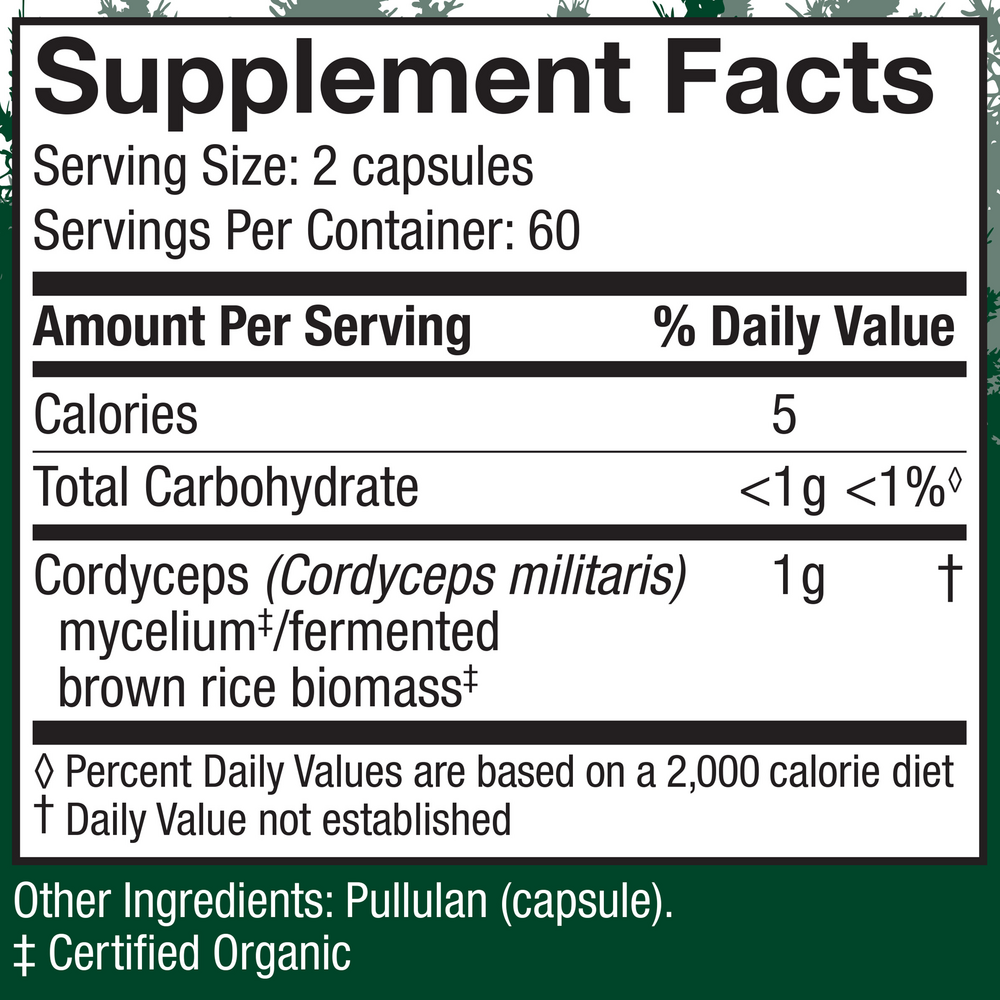 Host Defense® Cordyceps Capsules use activated, freeze-dried, Certified Organic mycelium, with a full spectrum of constituents: polysaccharides (beta glucans, arabinoxylane, glucose, xylose, galactose and cordycepic acid), glycoproteins, ergosterols, triterpenoids and other myco-nutrients, which are essential for Supporting Natural Immunity.*