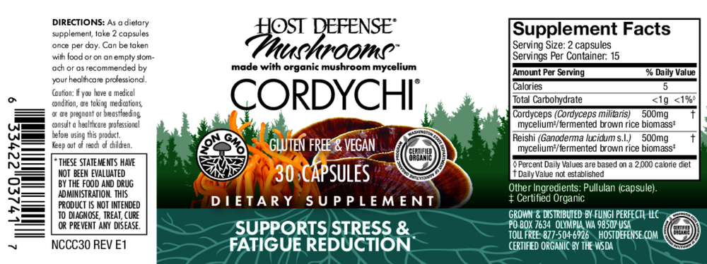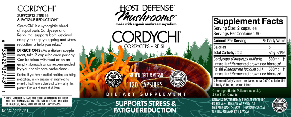 Host Defense® CordyChi® Capsules use activated, freeze-dried, Certified Organic mycelium, with a full spectrum of constituents: polysaccharides (beta glucans, arabinoxylane, glucose, xylose, galactose and cordycepic acid), glycoproteins, ergosterols, triterpenoids and other myco-nutrients, which are essential for Supporting Natural Immunity.*