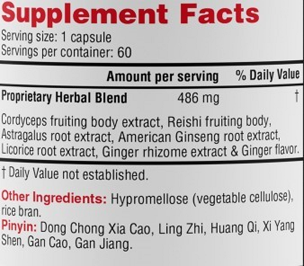 Suggested Use: Take one capsule, 3 times per day between meals, or as recommended by your health care practitioner. Serving size: 1 capsule Amount Per Serving Proprietary Herbal Blend … 486 mg Cordyceps fruiting body extract (dong chong xia cao), Reishi fruiting body (ling zhi), Astragalus root extract (huang qi), American Ginseng root extract (xi yang shen), Licorice root extract (gan cao), Ginger rhizome extract & natural Ginger flavor (gan jiang). Other Ingredients: Hypromellose (vegetable celluose), rice bran.