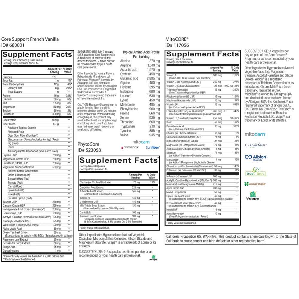 PhytoCore is part of the Core Restore Kit and supports Phase I and II liver detoxification. It supports the body's natural liver cleansing function during detoxification.