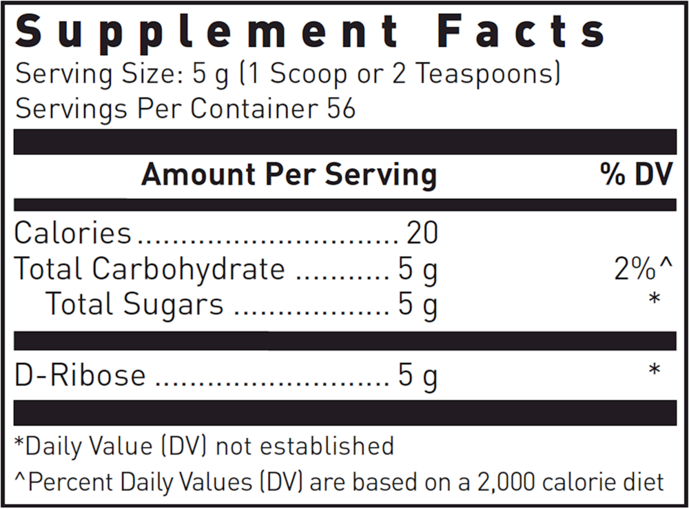 D-Ribose is a natural pentose sugar that is the backbone of the ATP molecular structure which supports the body's natural energy production. D-ribose in ATP (adenosine triphosphate) is naturally present in every living cell in our body. D-ribose powder is highly soluble in either hot or cold solutions and tastes slightly sweet.*