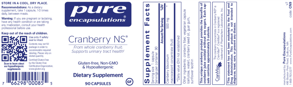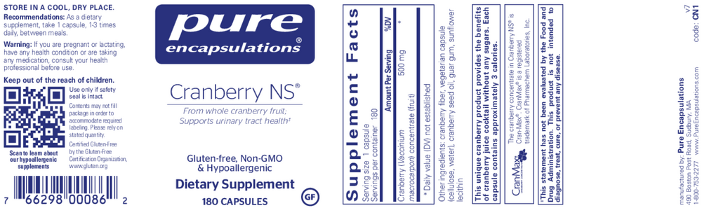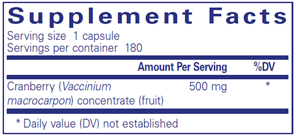 Cranberries have been used for hundreds of years as nutritional support for the urinary tract. Cranberry concentrate provides support without the unwanted sugar found in cranberry juice. The role of cranberry concentrate includes enhancing the acidity of urine and maintaining a healthy urinary tract ecology. Constituents of cranberry concentrate associated with its benefits include proanthocyanidins as well as d-mannose. Research has suggested the potential for cranberry juice to interact with lectin receptors and maintain a healthy bladder wall. A randomized double-blind, placebo-controlled trial involving over 150 female volunteers reported positive support for a healthy urinary tract after administration of a cranberry beverage. Pure Encapsulation cranberry concentrate is made from 100% whole cranberry fruit solids through a proprietary process that concentrates the health supporting components of cranberries without the use of solvents or sugars.*