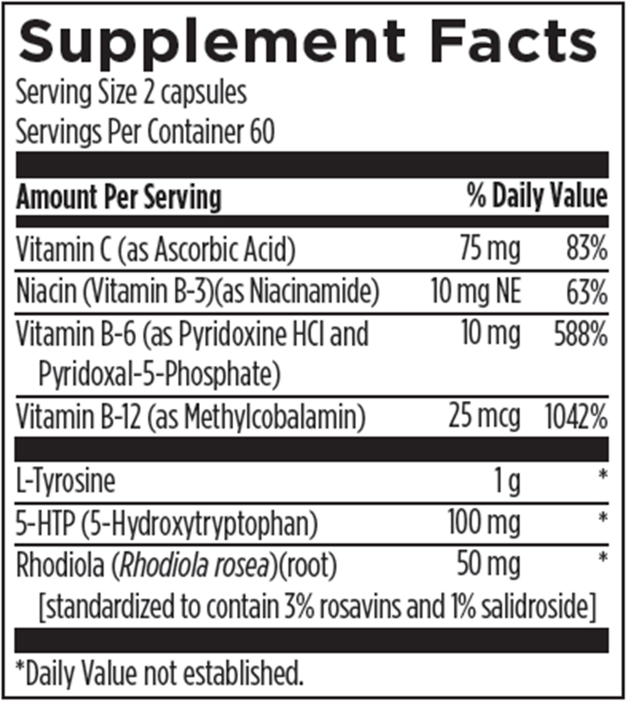 CraveArrest™ combines targeted nutrients and botanicals that help maintain healthy neurotransmitter production and function that influences the body’s craving signals.* This synergistic formula includes clinically relevant amounts of the precursors, L-tyrosine and 5-hydroxytryptophan (5-HTP), in a 10:1 ratio, along with B vitamins to support dopamine and serotonin production.* These neurotransmitters play an essential role in promoting normal appetite and cravings.* The adaptogenic herb, Rhodiola rosea, is included to encourage a healthy stress response.*
