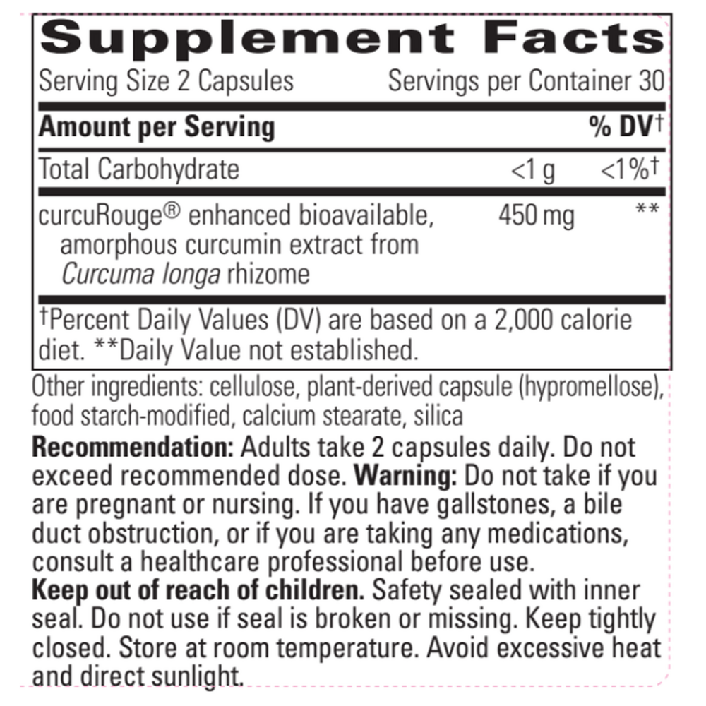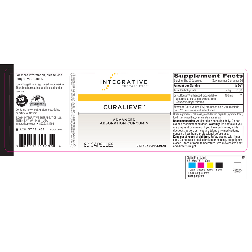 Integrative Therapeutics Curalieve provides advanced absorption curcumin due to its amorphous structure and excipient profile, which contributes to enhanced dispersibility and bioavailability. Curcumin has been studied and evaluated for its role in supporting antioxidant pathways and its effects on the body.*1,2 Curalieve’s key ingredient is curcuRouge®, an amorphous solid dispersion of curcumin.