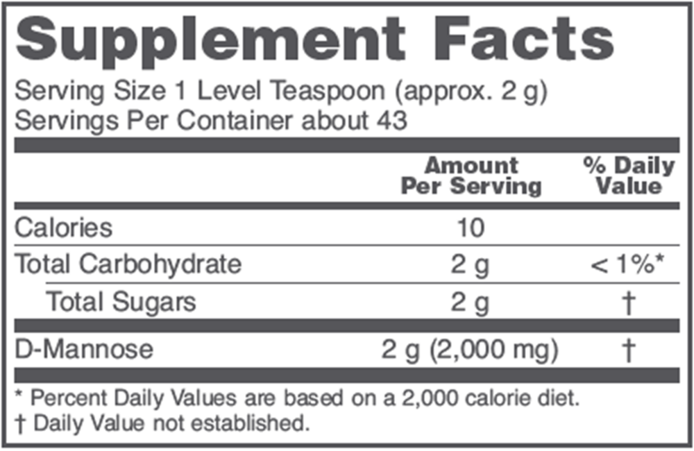 D-Mannose is a simple sugar that is taken up in the GI tract and rapidly excreted in the urine without affecting blood sugar regulation.* D-Mannose helps to support a normal environment within the bladder by maintaining a healthy mucosal lining and promoting proper elimination.* Clinical studies indicate that D-Mannose can help to maintain normal urinary tract health when used regularly.*