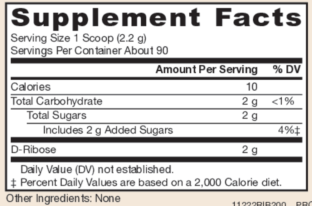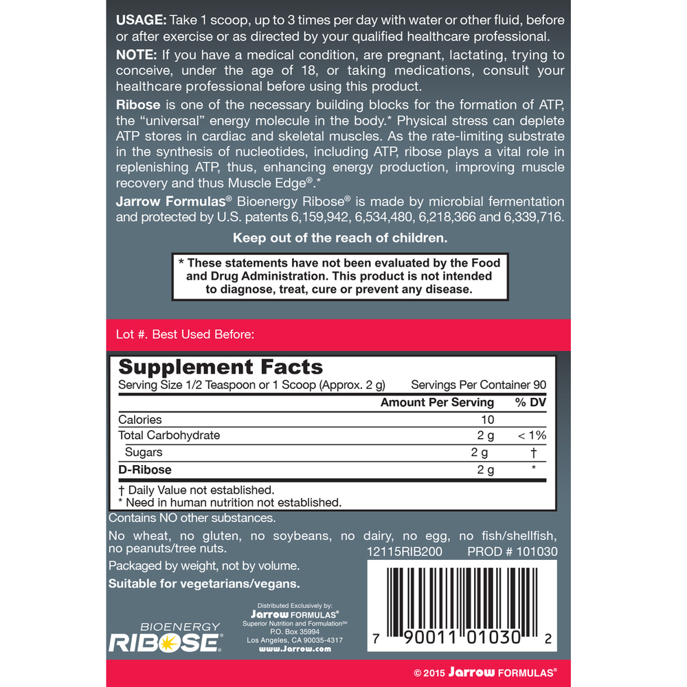 "Jarrow Formulas® D-Ribose, featuring Bioenergy Ribose®, is made by microbial fermentation and is protected by U.S. patents 6,159,942, 6,534,480, 6,218,366 and 6,339,716. Ribose is one of the necessary building blocks for the formation of ATP, the universal energy molecule in the body.* Physical stress can deplete ATP stores in cardiac and skeletal muscles. As the rate-limiting substrate in the synthesis of nucleotides, ribose plays a vital role in replenishing ATP, which helps to promote cellular energy, muscle recovery, and endurance.*"