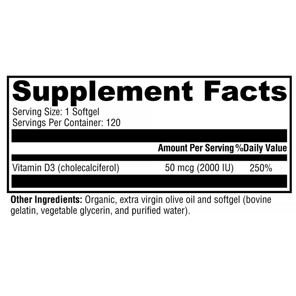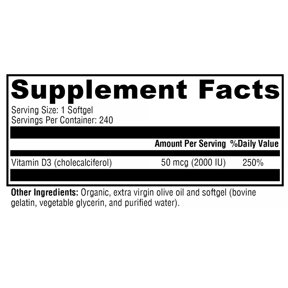 D3 2000 contains vitamin D3 (cholecalciferol) in convenient softgels. Vitamin D3 is the bioidentical form of vitamin D synthesized in the body from cholesterol, following activation by the UV rays in sunlight. This form is excellent for maintaining healthy levels of vitamin D in the body. Mounting evidence suggests roles for vitamin D not only in bone health, but also in supporting immune, neurological, musculoskeletal, cellular, and cardiovascular health.*