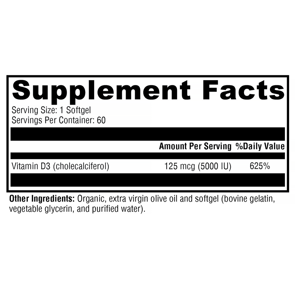 D3 5000 contains vitamin D3 (cholecalciferol) in convenient softgels. Vitamin D3 is the bioidentical form of vitamin D synthesized in the body from cholesterol, following activation by the UV rays in sunlight. This form is excellent for maintaining healthy levels of vitamin D in the body. Mounting evidence suggests roles for vitamin D not only in bone health, but also in supporting immune, neurological, musculoskeletal, cellular, and cardiovascular health.*