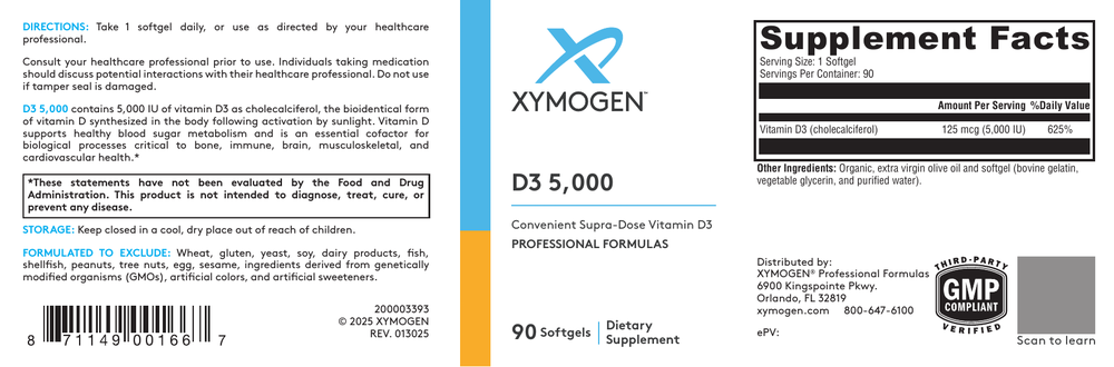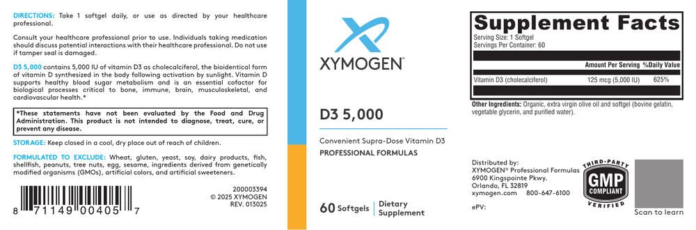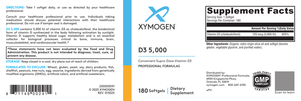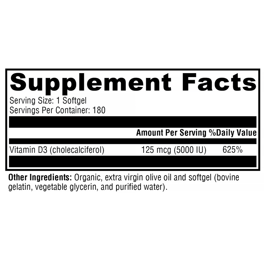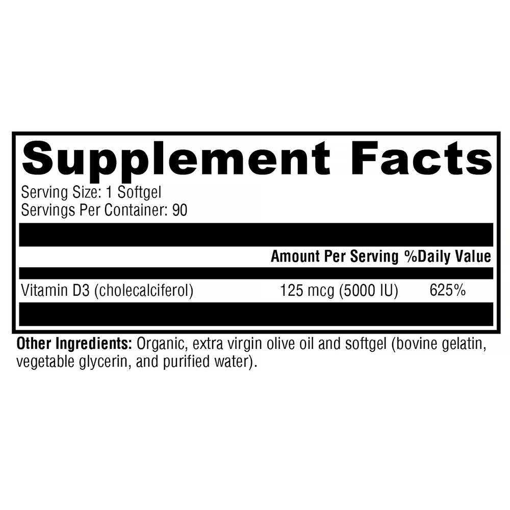 D3 5000 contains vitamin D3 (cholecalciferol) in convenient softgels. Vitamin D3 is the bioidentical form of vitamin D synthesized in the body from cholesterol, following activation by the UV rays in sunlight. This form is excellent for maintaining healthy levels of vitamin D in the body. Mounting evidence suggests roles for vitamin D not only in bone health, but also in supporting immune, neurological, musculoskeletal, cellular, and cardiovascular health.*