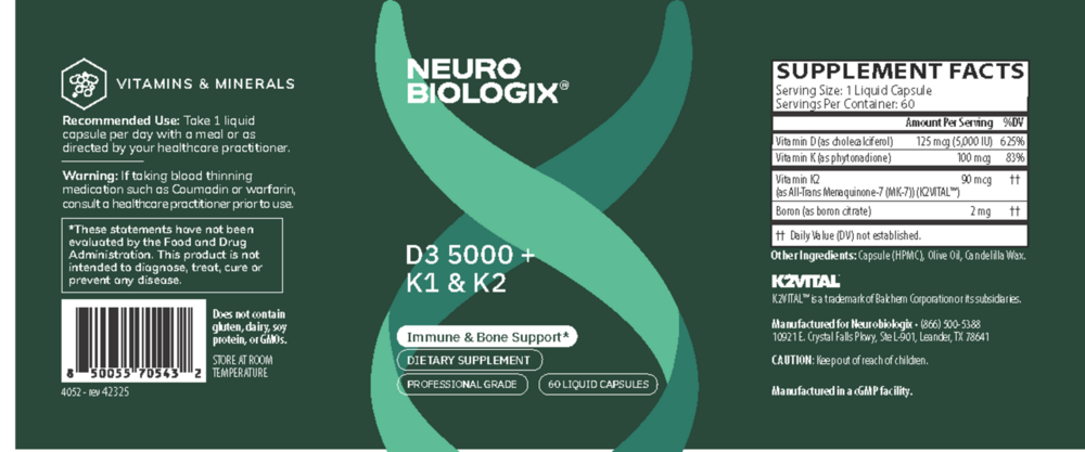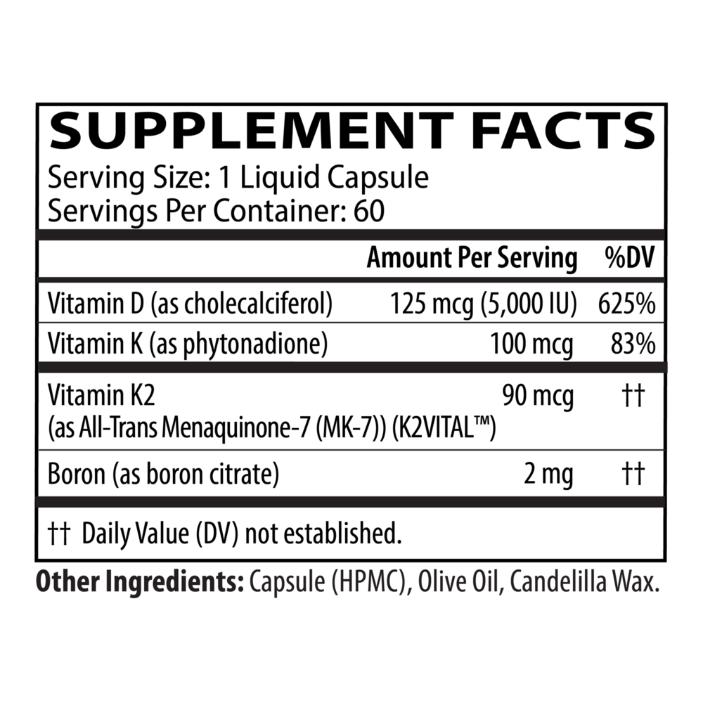 D3 5000 + K1/K2 contains the most bioavailable and bioactive version of vitamin K2 available (K2VITAL® MK7), paired with 5000 IUs of vitamin D3 (cholecalciferol), and available in a liquid capsule with olive oil for improved absorption.* The vitamin D3 in D3 5000 + K1/K2 helps transport calcium from the intestines into the bloodstream as the Vitamin K2 directs the calcium into the bones while also supporting the minimization of calcium buildup in the arteries.*